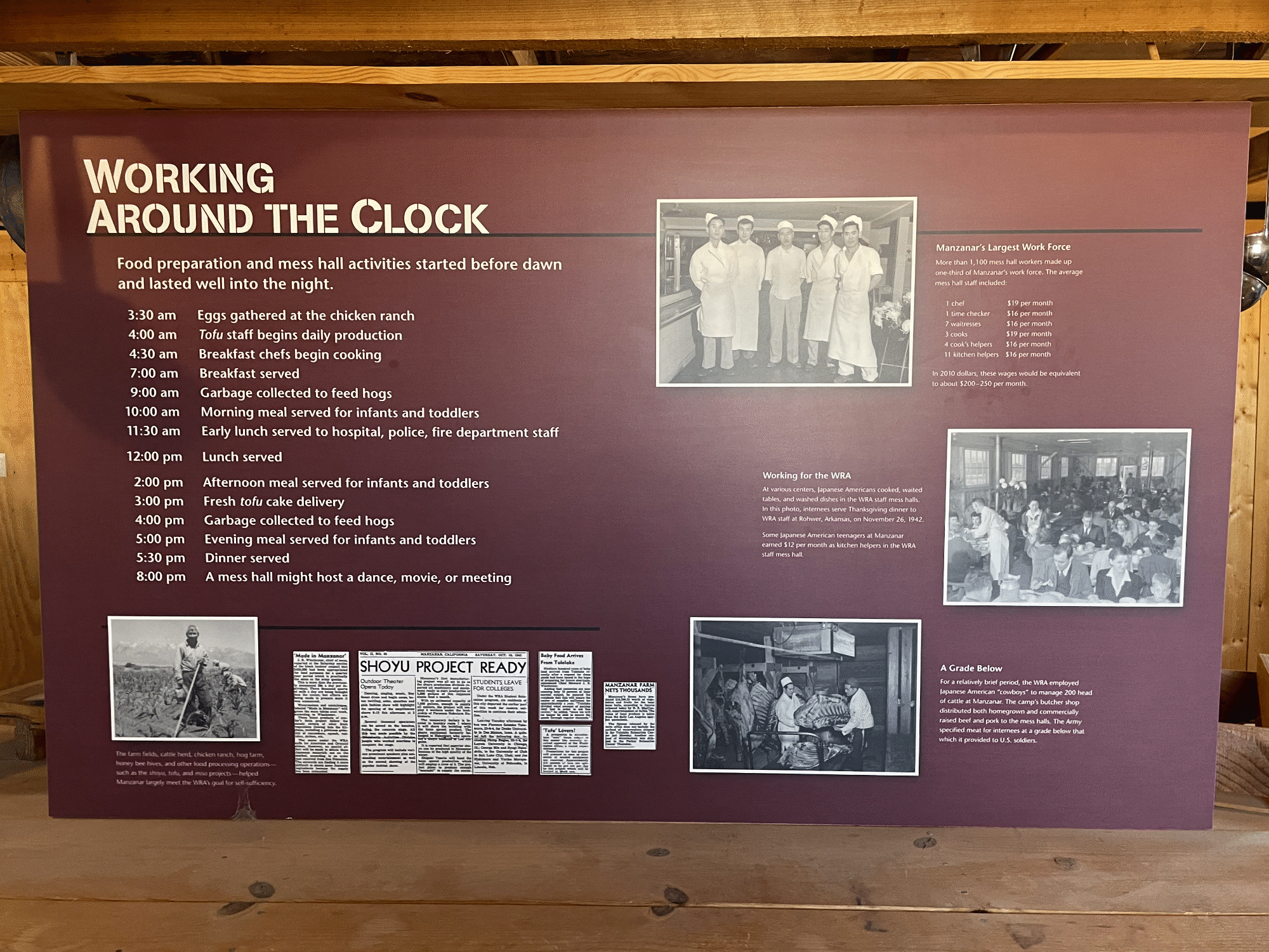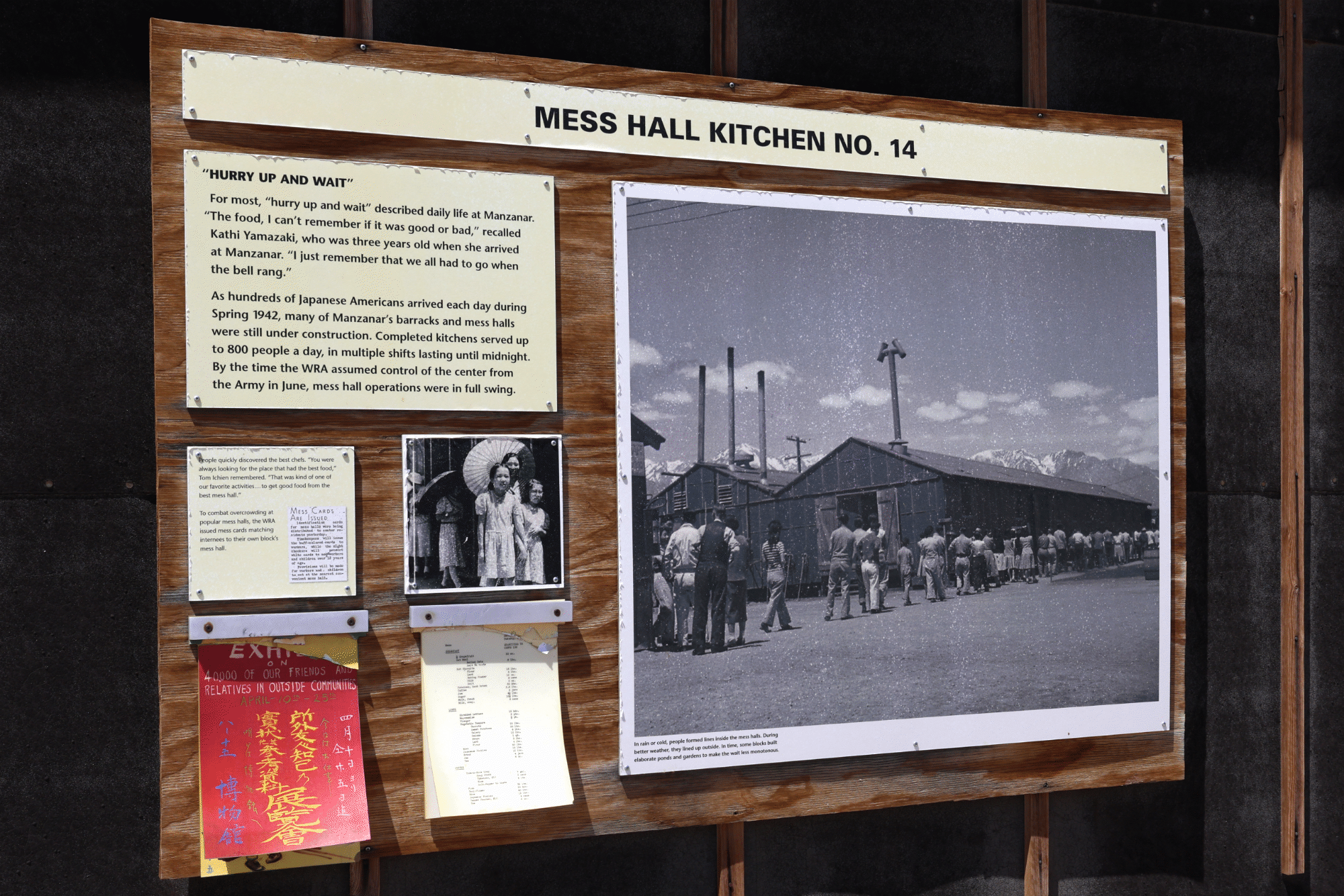 Open for roughly 3.5 years (from March 1942 to November 1945) Manzanar transformed a desolate stretch of the Owens Valley into a high-density prison city. "Residents" were forced into cramped 20x25-foot barracks offering zero privacy and little protection from the extreme climate. Life was a constant struggle against the elements and the indignity of communal living. People stood in long lines for mess hall meals, used open-latrine bathrooms that stripped away any chance for personal privacy.