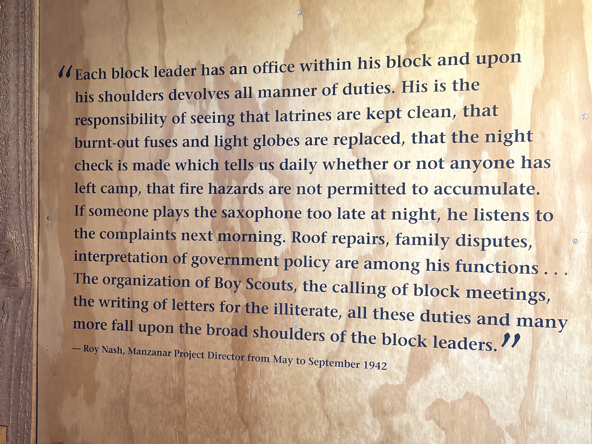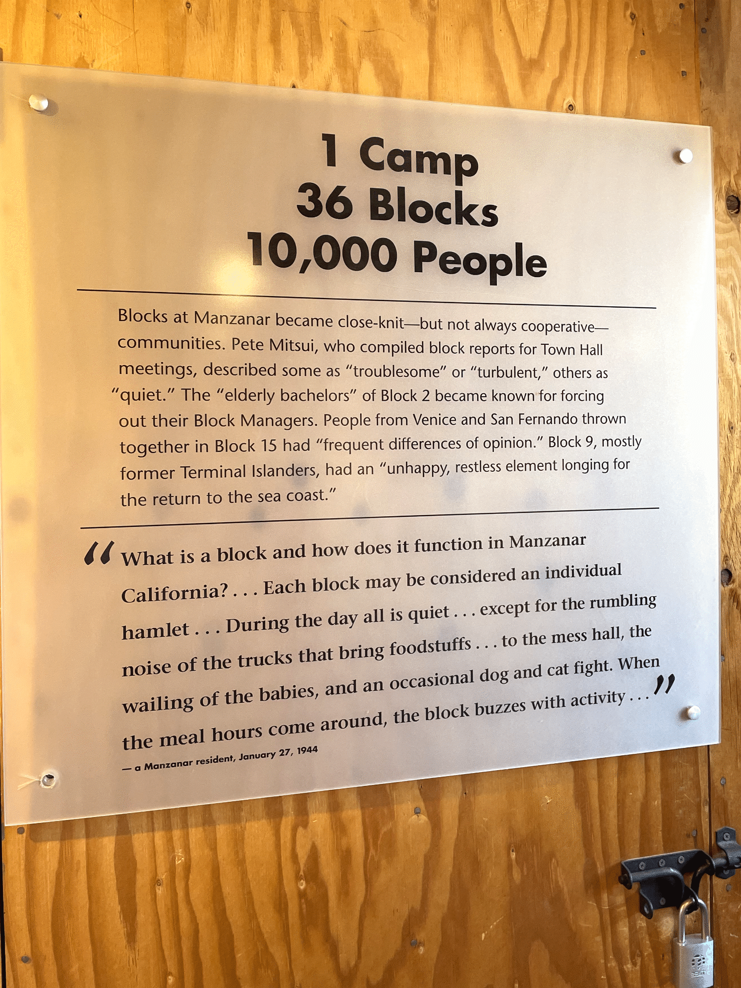 For decades, the term "internment camp" was the standard euphemism used to describe Manzanar, portraying it to almost sound like a summer camp or a temporary stay. But survivors and the National Park Service fought to return to a more accurate term: Concentration Camp. Sure, it may not have been the Nazi death camps that the term typically conjures to mind, but by the literal definition of the word, this was indeed a concentration camp. It was a place where people were imprisoned not because they committed a crime, but because of who they were. In 1944, even President Roosevelt called them concentration camps.